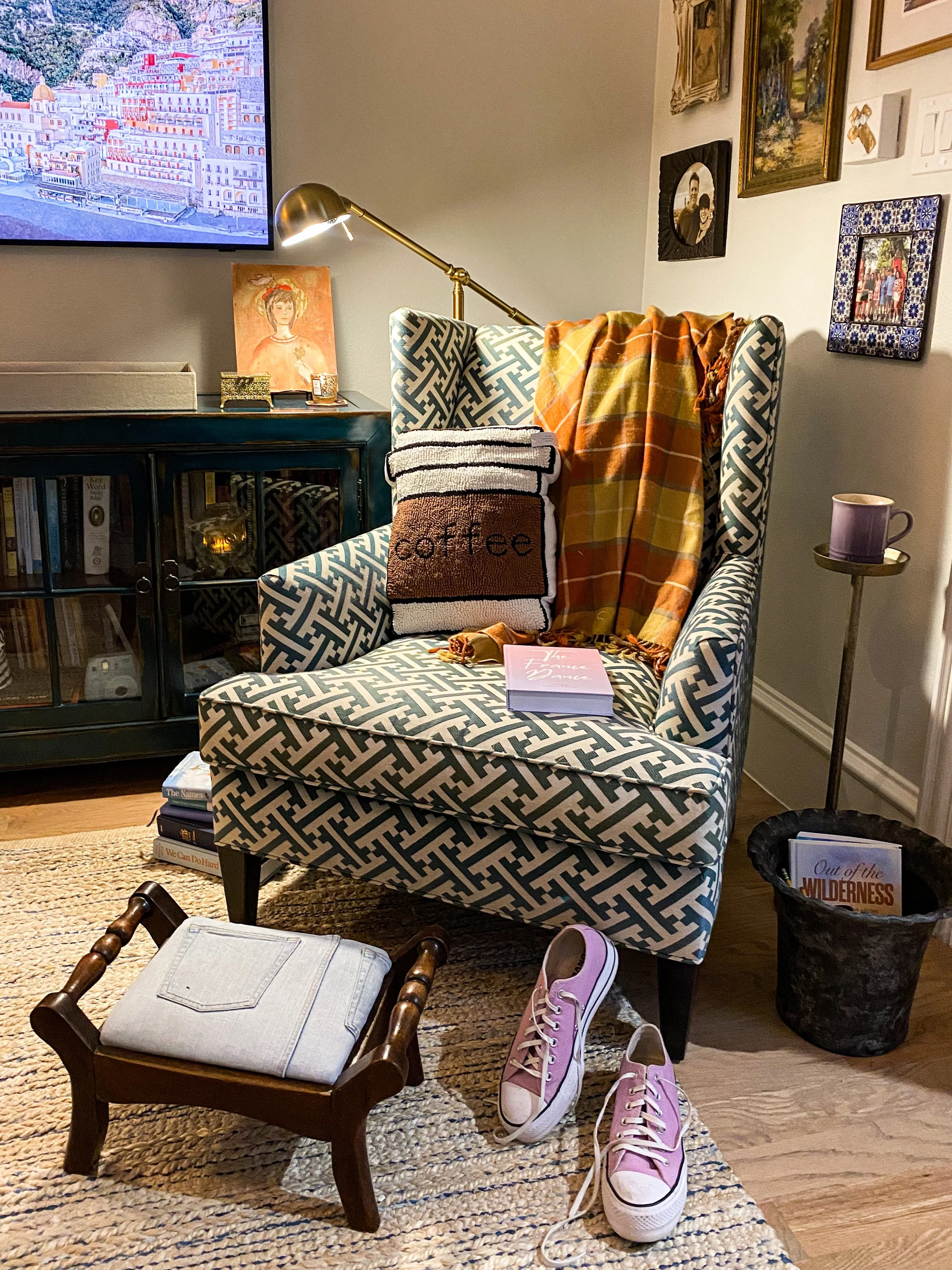 On the opposite wall from the writing desk is a small wingback chair that once sat in our living room. The corner where it sat always looked boring and unappealing to me, but then I saw the picture below on Instagram and I had an idea. @alabasterfox is known for cozy moments and warm interiors, and I felt inspired to create a similar space.